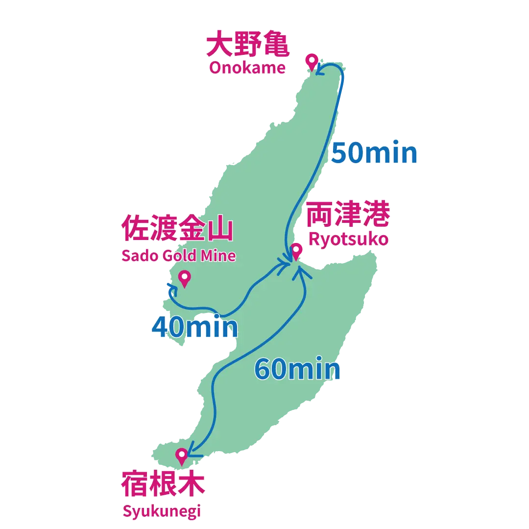 - 両津港 〜 佐渡金山(相川エリア):約40分